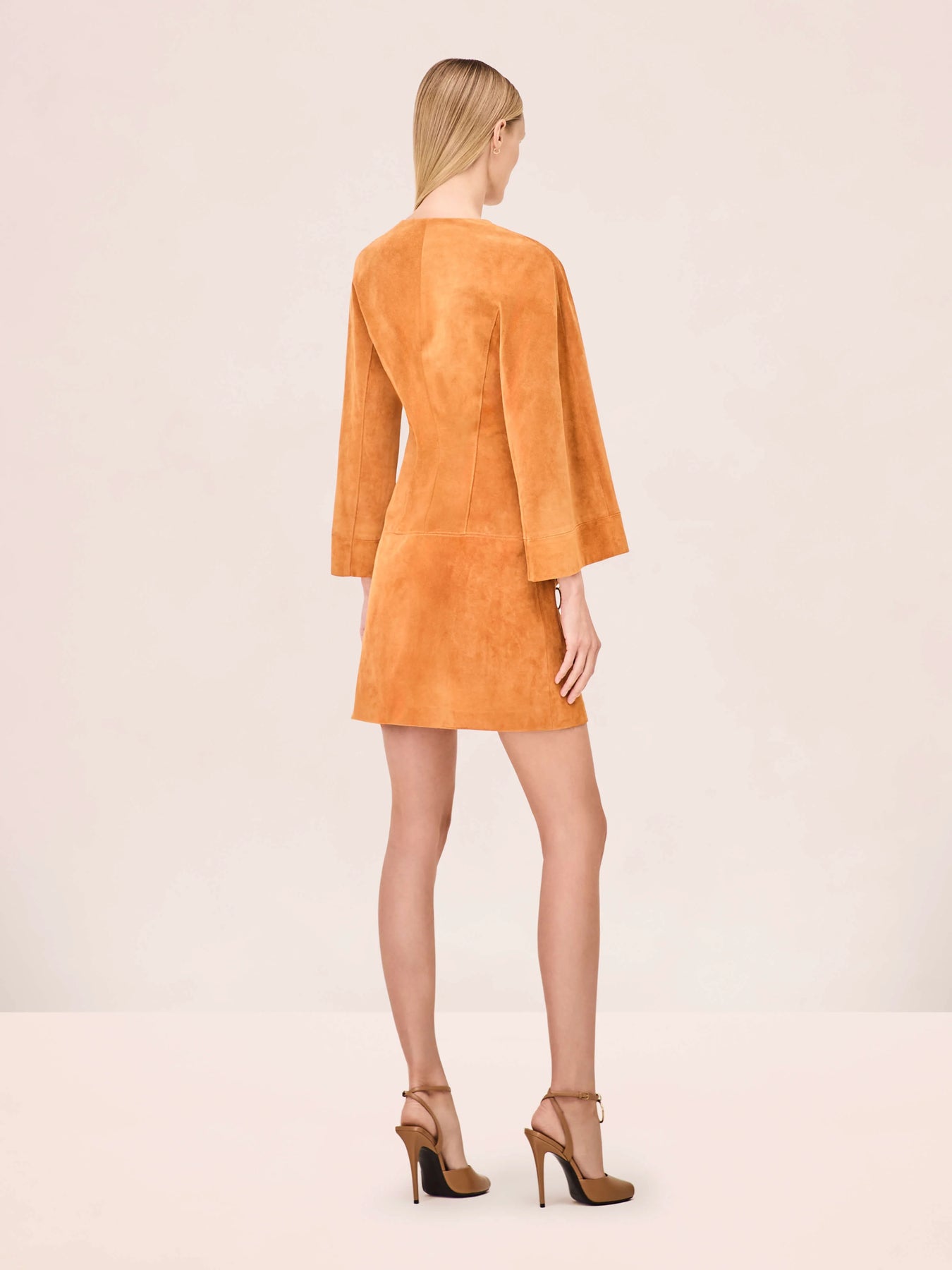 The Kendra Dress is a sleeveless suede midi dress featuring a sweetheart neckline, fitted bodice, and a waist tie detail.